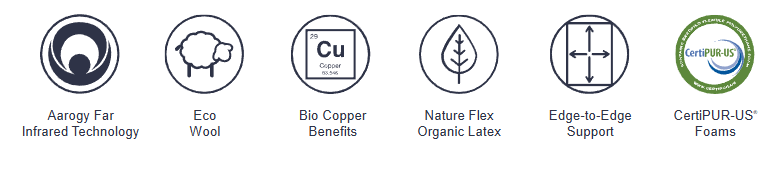 Design: Aarogy fabric with Joma wool, 1½" copper memory foam, 3" firm natural latex, and 8" Quantum Edge® coil unit